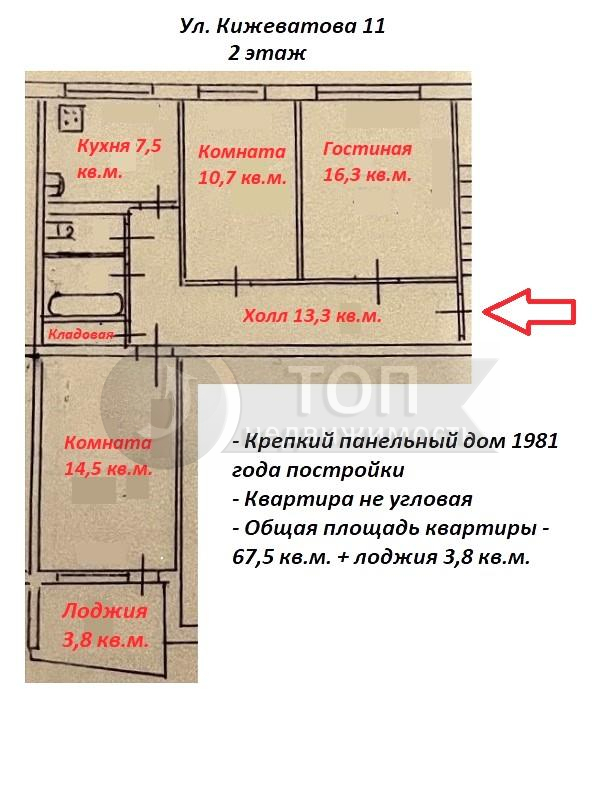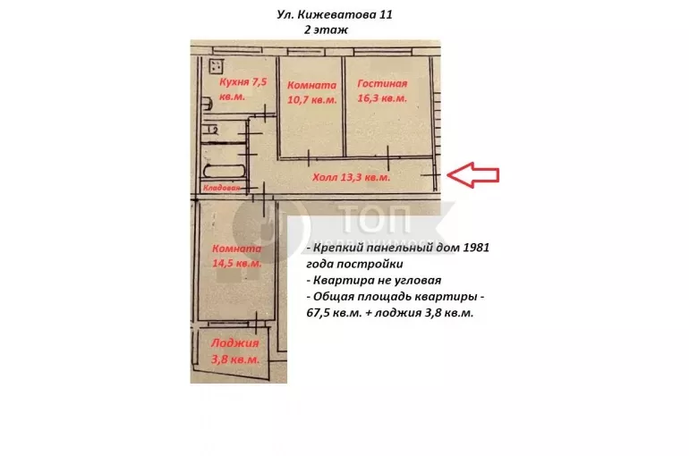 - Общая площадь квартиры с учетом застекленной лоджии – 67,5 кв.м. (+ застекленная лоджия 3,8 кв.м.);
