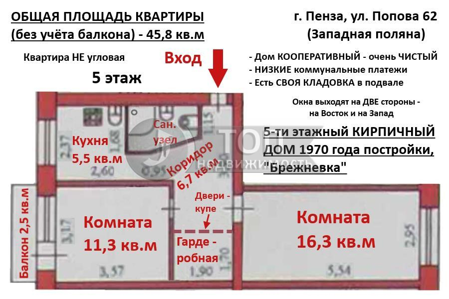 Квартира расположена на 5-м этаже 5-ти этажного дома по адресу ул. Попова, д. 62 .