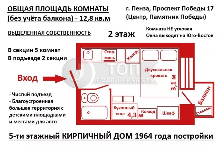 ОБЩАЯ ПЛОЩАДЬ КОМНАТЫ (без учёта балкона): 12,8 кв.м + балкон 1,0 кв.м.