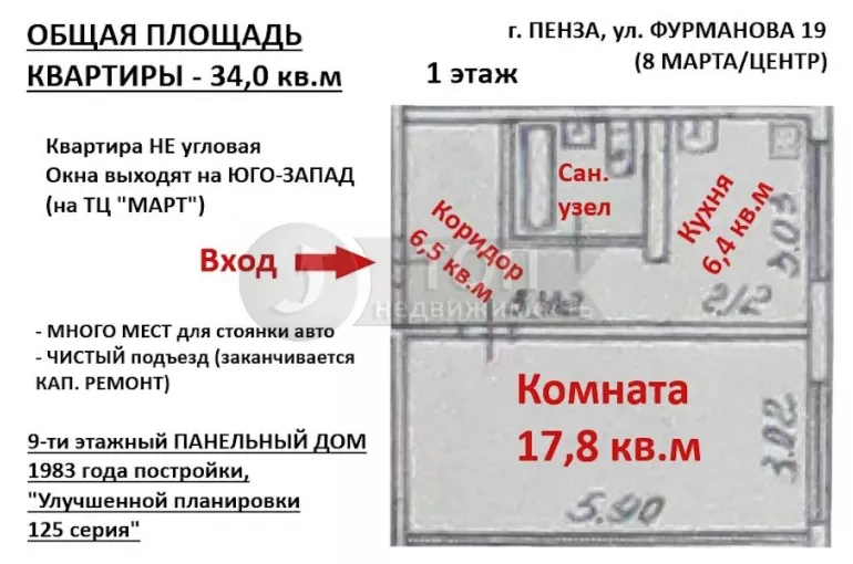 ОБЩАЯ ПЛОЩАДЬ КВАРТИРЫ: 34,0 кв.м (комната 17,8 кв.м, кухня 6,4 кв.м, коридор 6,5 кв.м, сан. узел совмещенный 3,3 кв.м).