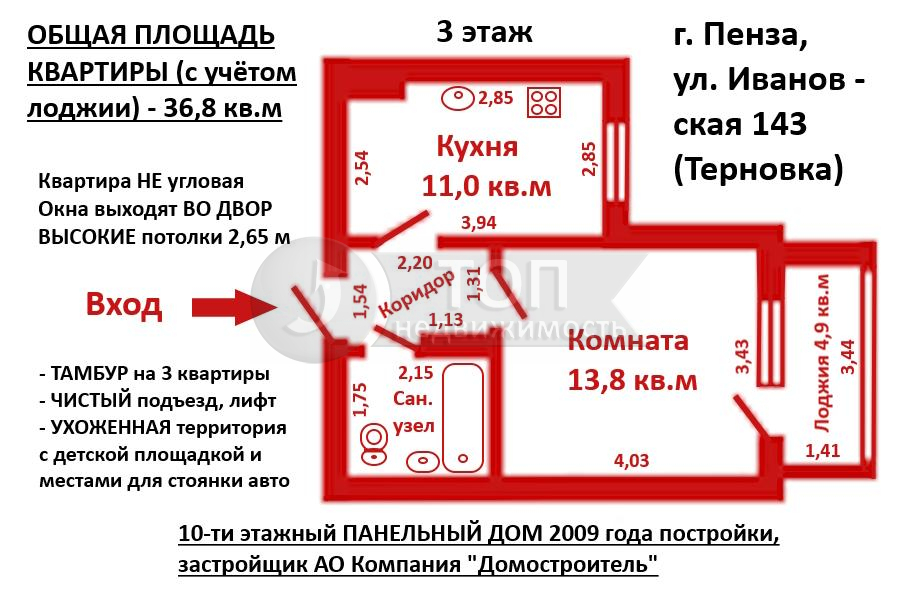ОБЩАЯ ПЛОЩАДЬ КВАРТИРЫ (с учётом лоджии): 36,8 кв.м (комната 13,8 кв.м, кухня 11,0 кв.м, коридор 3,3 кв.м, сан. узел совмещенный 3,8 кв.м, лоджия 4,9 кв.м).