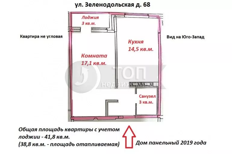 - Общая площадь квартиры – 38,8 кв.м. (+ лоджия 3 кв.м. с панорамным остеклением и отличным видом на закаты);
