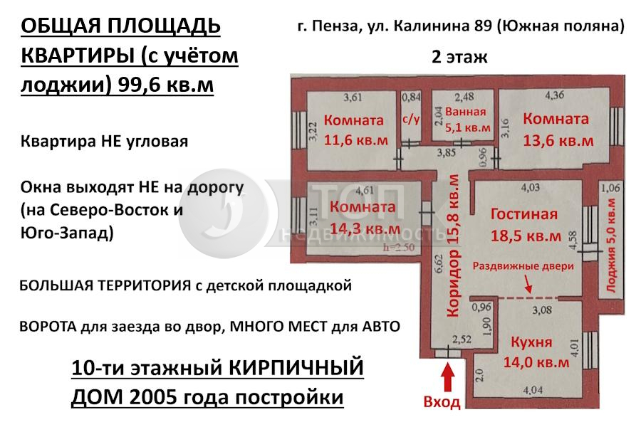 ОБЩАЯ ПЛОЩАДЬ КВАРТИРЫ (с учётом лоджии): 99,6 кв.м (три изолированные комнаты 14,3 + 13,6 + 11,6 кв.м, гостиная 18,5 кв.м, кухня 14,0 кв.м, коридор 15,8 кв.м, ванная 5,1 кв.м, сан. узел 1,8 кв.м, лоджия 5,0 кв.м).