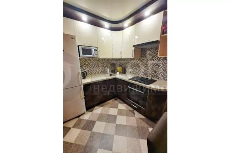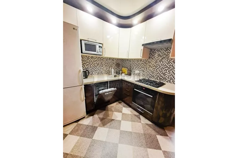 Напротив входа расположено сердце любой квартиры - кухня (7 кв. м.), оснащенная по последним веяниям моды: кухонным гарнитуром с каменной столешницей и интегрированной в неё каменной мойкой, обеденной зоной, кроме того здесь размещен холодильник, духовой шкаф, варочная поверхность, вытяжка, СВЧ, ПОСУДОМОЕЧНАЯ машина и телевизор.